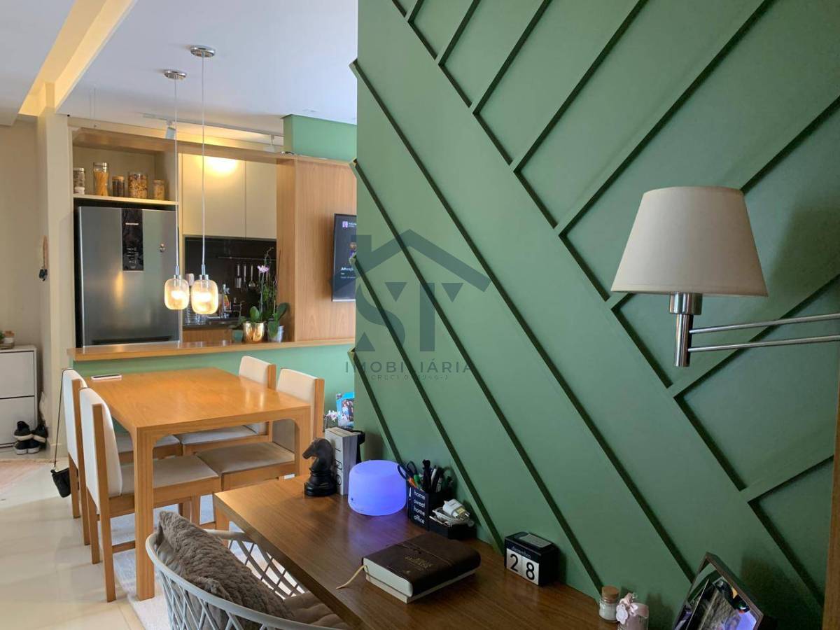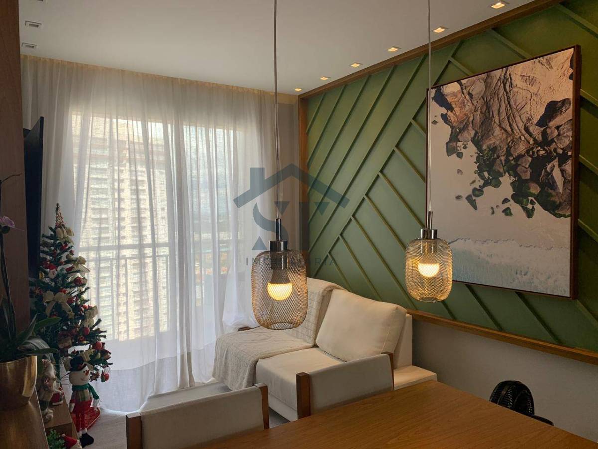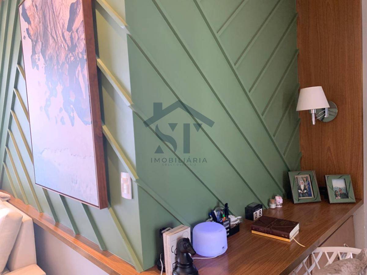A sala de estar, decorada com bom gosto, cria um ambiente aconchegante e sofisticado, ideal para momentos de descanso ou recepções especiais. O espaço ainda conta com um canto de escritório planejado, perfeito para quem precisa de um local tranquilo para trabalhar ou estudar.