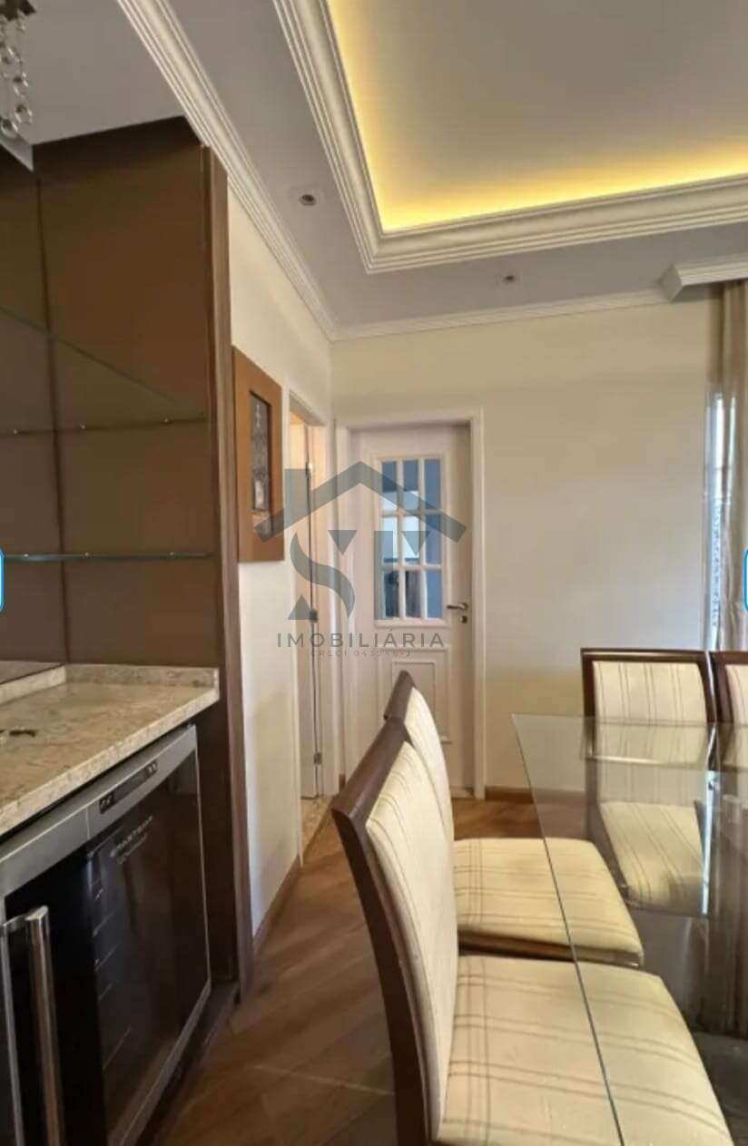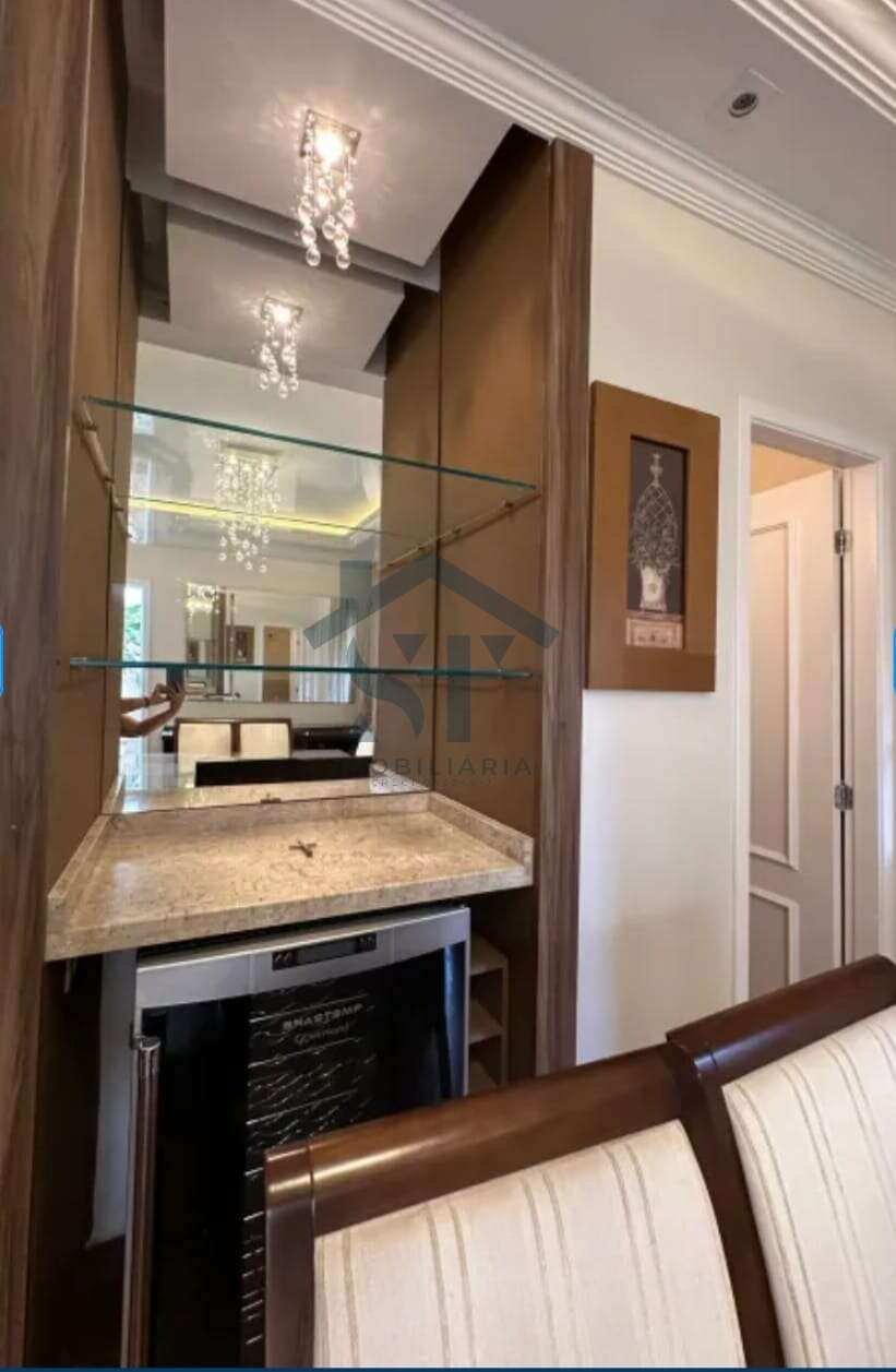 Sala dois ambientes integrada, com mesa de jantar, bar moderno e ar-condicionado