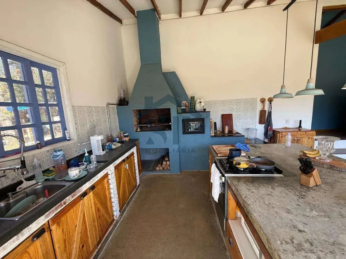 Cozinha ampla com churrasqueira, fogão a lenha e forno de pizza, integrada à sala